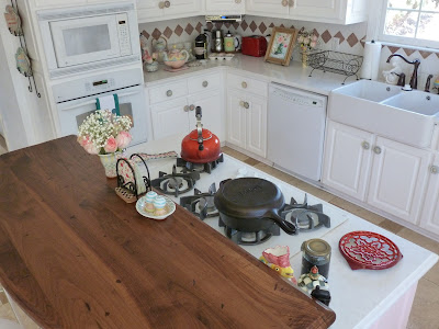 Oh, RJ! I love your kitchen - it's gorgeous! Your backsplash really stands out and your countertops look wonderful. I'm just loving you precious pink island and all of your pretty MC pieces. I want a kitchen like yours! Oh, your farm sink is something I always wanted but never did get it! Boo Hoo! :) Now don't cook or anything and mess up that beautiful space.