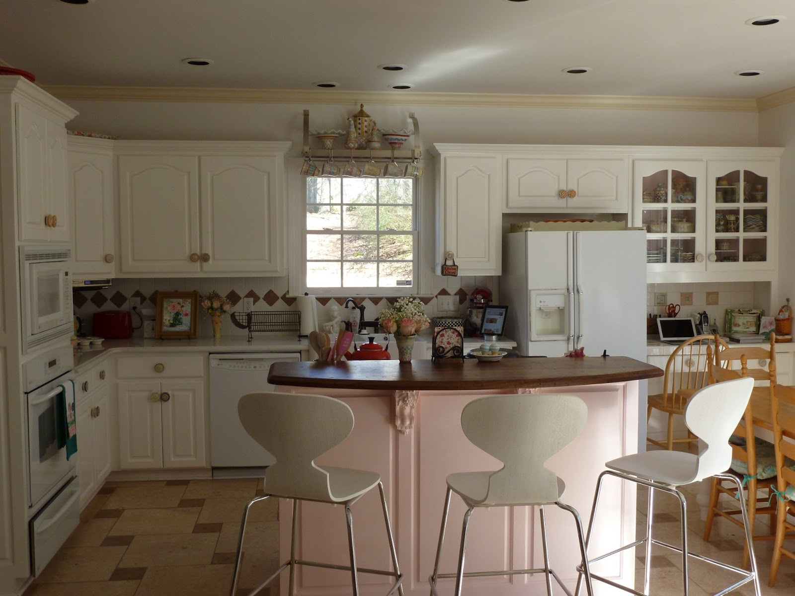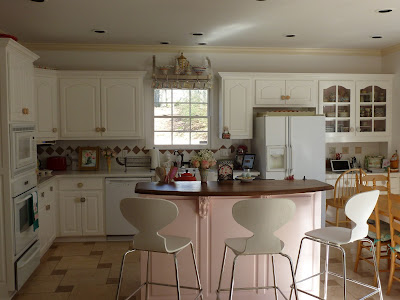 Oh my gosh...I hope a magazine see's this! You have got to get it published. How fabulous and brave to paint the island pink. When you think about it...It's only paint. What a fabulous kitchen, yep, I would move my bed right in there!!