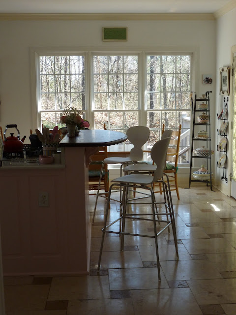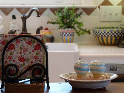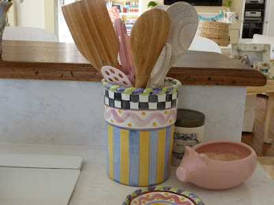 When I saw pink kitchen at Nita's I had to come visit! I love your new kitchen and you have accessorized it beautifully. I love all your pottery, especially the fish as I collect old Italian majolica fish. My fish led me to try to take our retro white, black and red kitchen that had just been done in '08 to pinks and charcoal gray, the color of my fish. Other changes are coming slowly and I'm still stuck with red molding between the kitchen and family room and the yellow walls that I actually still like and am just trying to see them as neutral. I enjoyed looking at your accessories for ideas how I can bring mine more into what I want it to be. Like the little pink pig--I have an old Fiesta tea pot just that color. Must get it out!